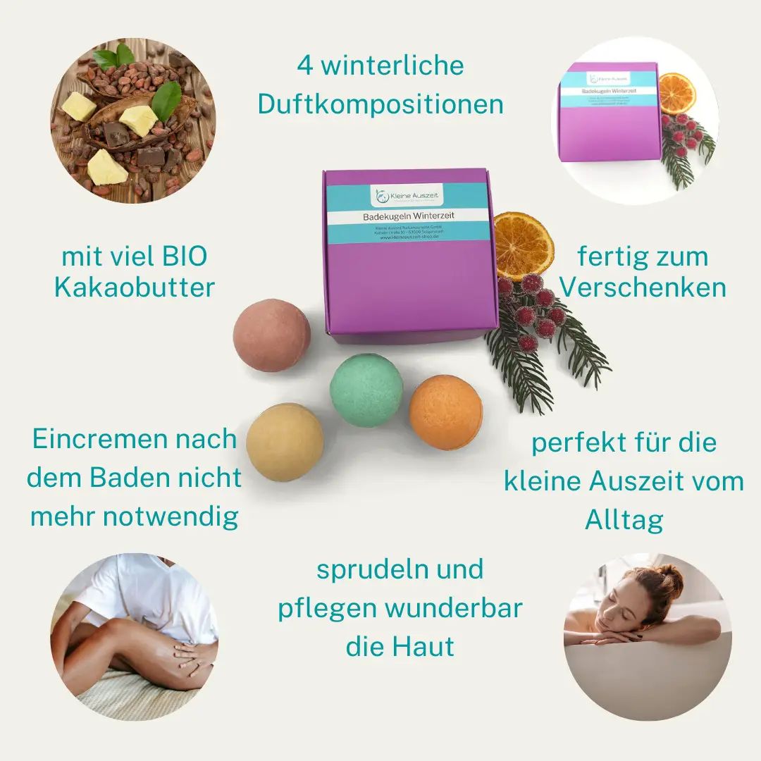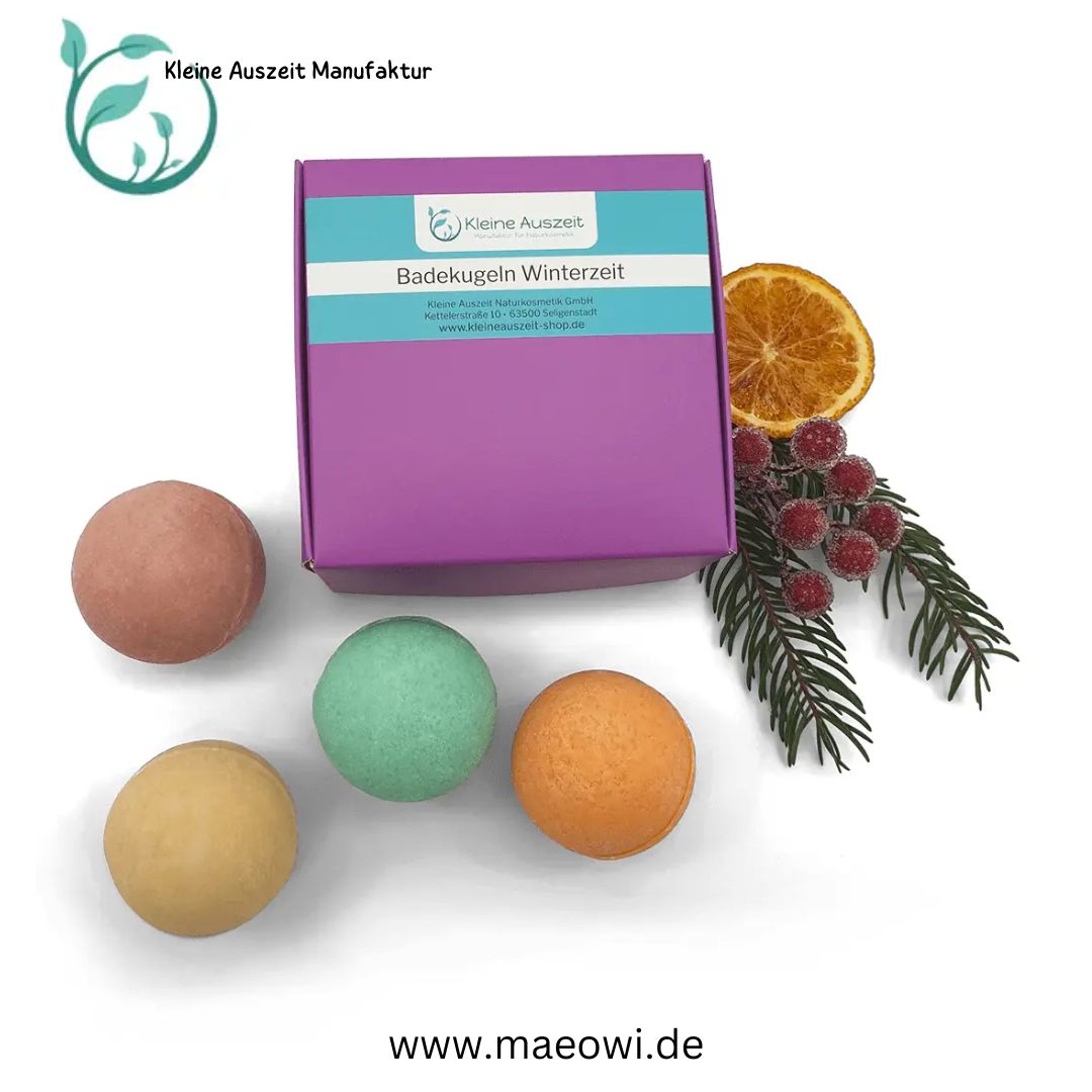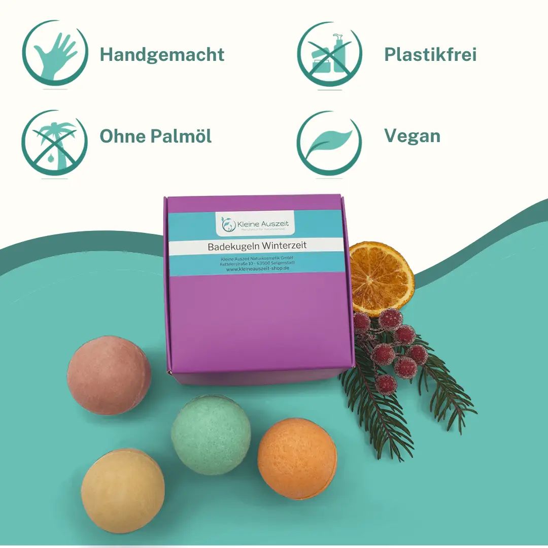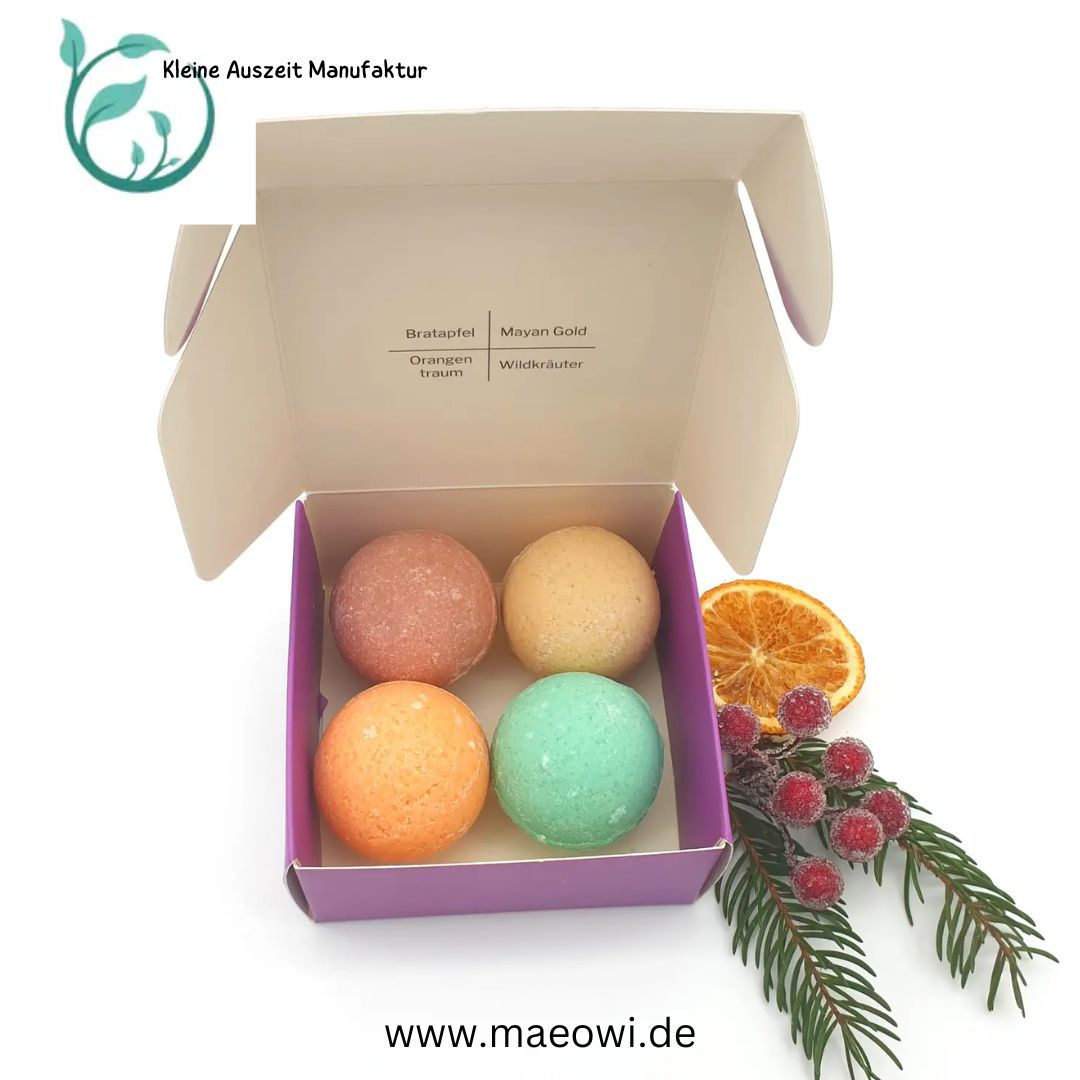 Die Winterzeit ist die Zeit der Gemütlichkeit. Und mit diesen Badekugeln in Winterdüften (Bratapfel, Wildkräuter, Mayan Gold und Orangentraum) kann man es sich gleich 4 mal so richtig gut gehen lassen in der Badewanne. Die Badekugeln sind vegan, palmölfrei und werden plastikfrei in der Geschenkbox fertig zum Verschenken verschickt. Zutaten Natriumbicarbonat, Zitronensäure, Theobroma-Kakaosamenbutter, Zea-Mays-Stärke, Parfum, Limonen*, Zimt*, Eugenol*, Linalool*, Cumarin*, CI 77891, CI 77492, Glimmer, CI 77491, CI 15850, CI 77007 * Allergen , die sowohl in ätherischen Ölen als auch in Parfümölen kommt vor