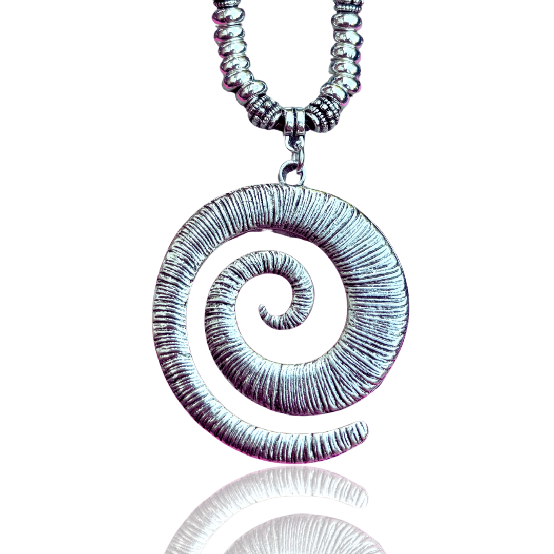Unsere Halskette "RELIC" bringt einen Hauch von Vintage in dein Outfit! Der auffällige verchromte Spiralanhänger und das Lederband verleihen dem Schmuckstück einen besonderen Charme. Sehr schön für alle, die ihrem Look einem Hauch von Nostalgie verleihen möchten. Deine eigene "RELIC" Halskette wird zum Blickfang!