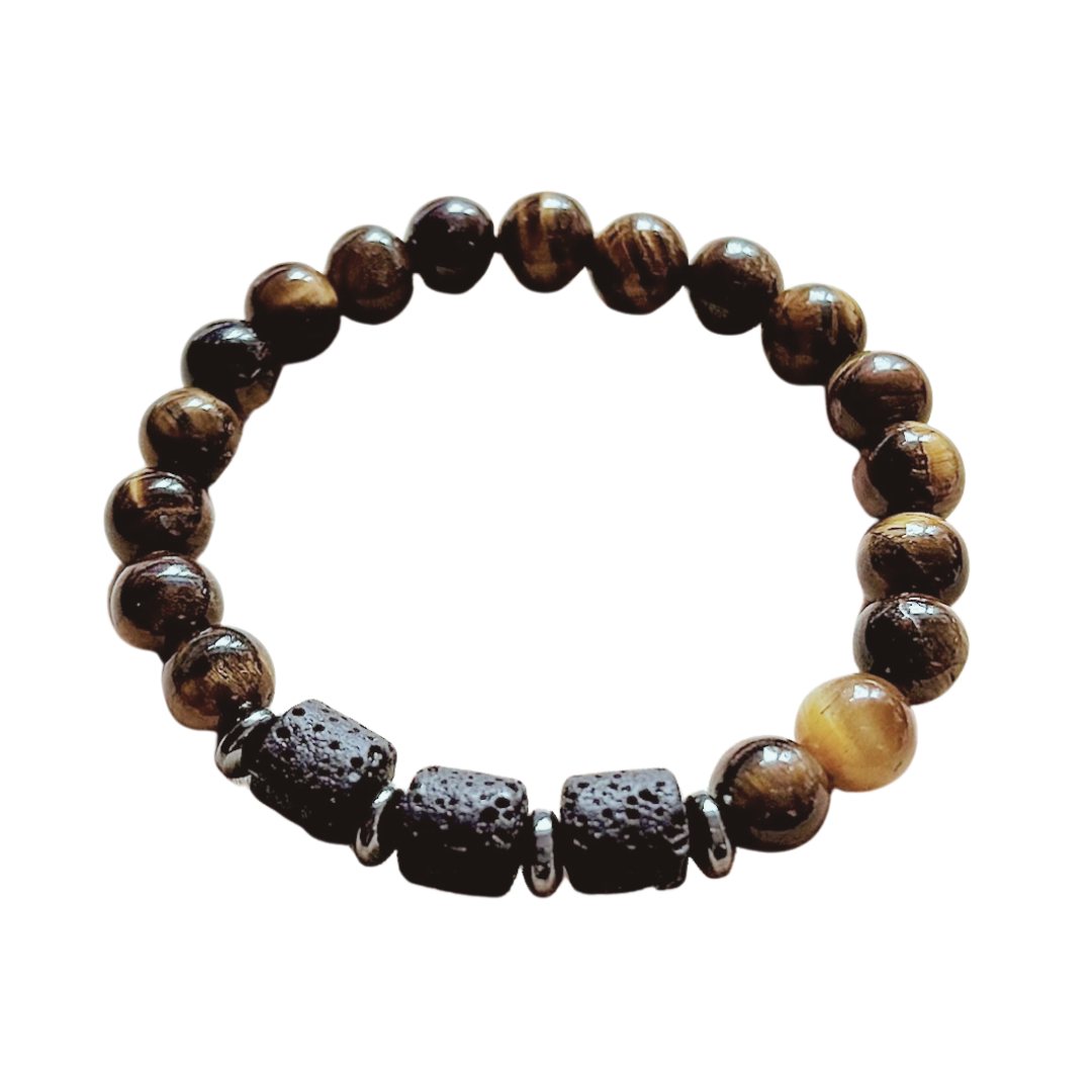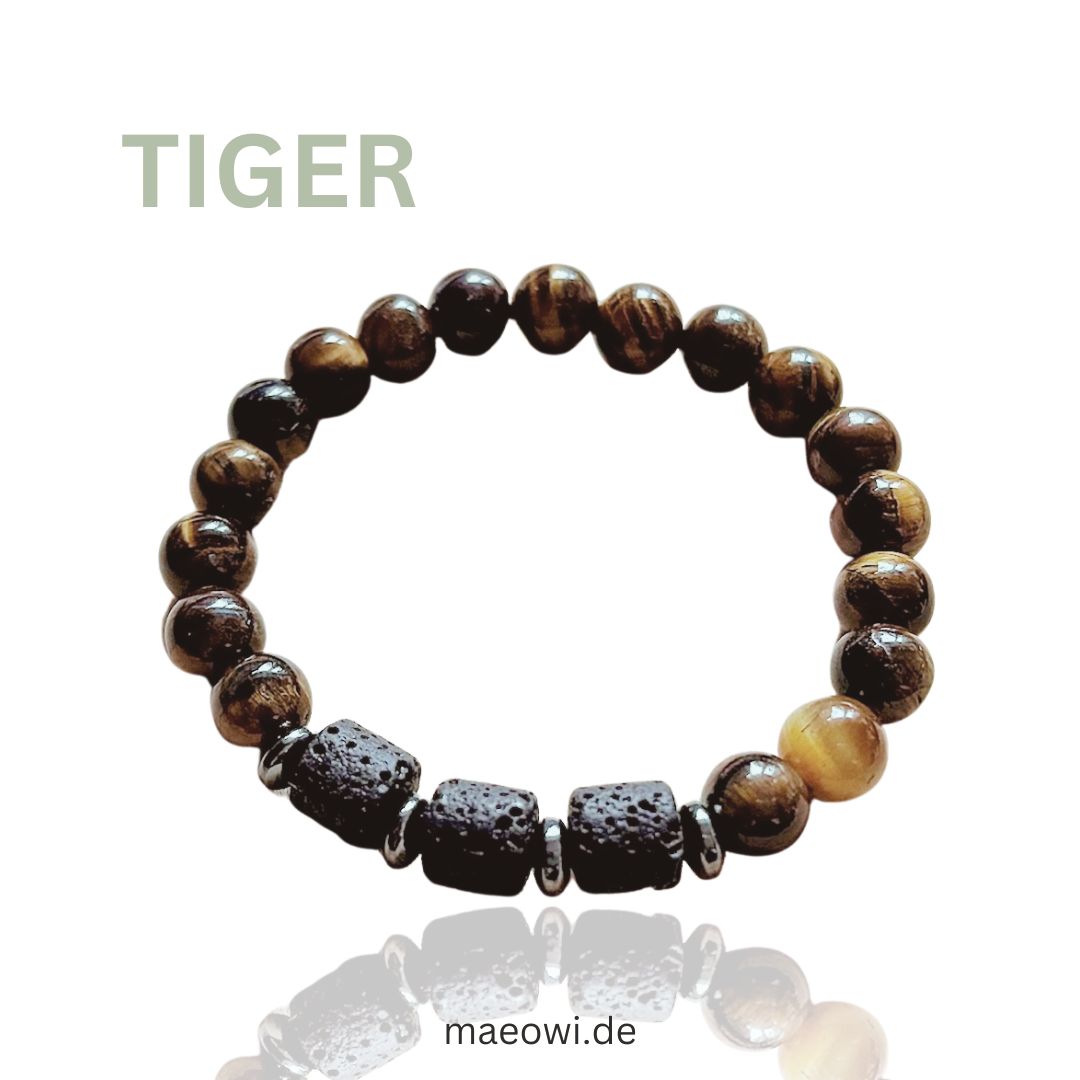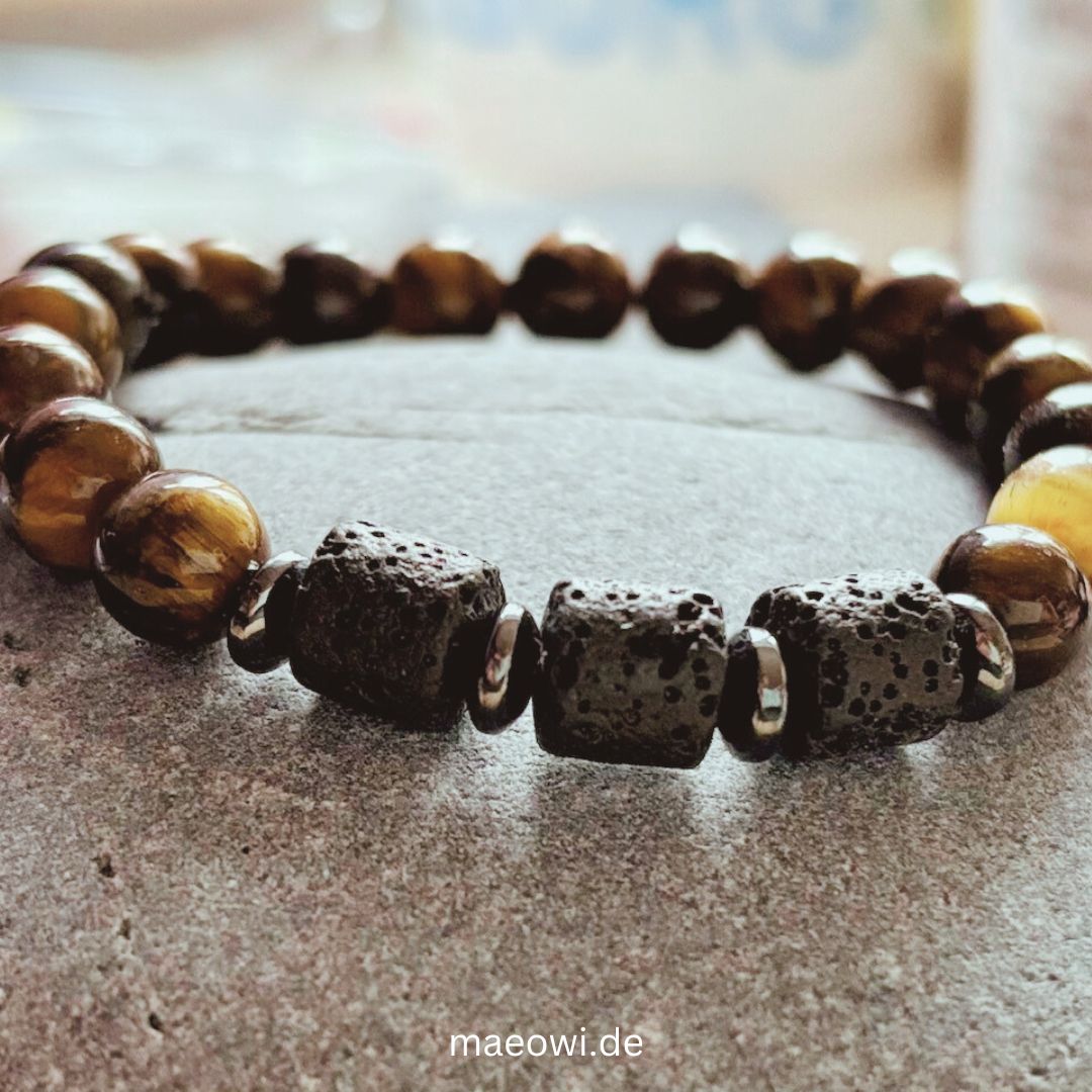 Entdecken Sie unser stilvolles Armband aus Naturstein, das die kraftvollen Eigenschaften von Tigerauge und Lavasteinen vereint. Das Tigerauge besticht durch seine einzigartigen goldbraunen Schattierungen und verleiht dem Armband eine edle Note, während die Lavasteine für eine robuste Textur sorgen und gleichzeitig eine beruhigende Wirkung haben. Dieses Armband ist nicht nur ein modisches Accessoire, sondern auch ein Symbol für Stärke und Selbstbewusstsein. Perfekt für den Alltag oder besondere Anlässe – Setze ein Statement mit diesem einzigartigen Schmuckstück! Versand aus Deutschland.