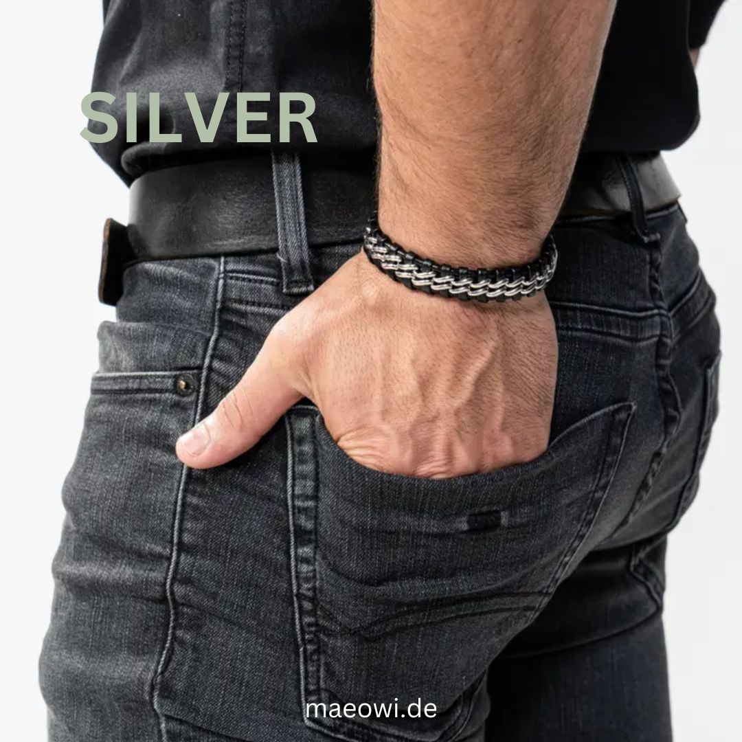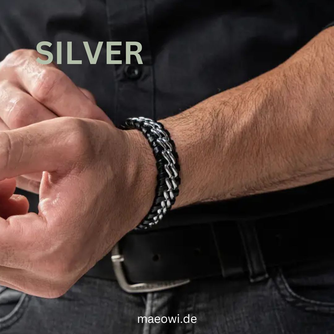 Das Lederarmband „SILVER“ ist aus hochwertigem Rindsleder gefertigt und mit einem rost- und nickelfreien Edelstahl-Magnetverschluss ausgestattet. Ein zusätzliches Glied ermöglicht eine individuelle Längenanpassung. Perfekt als Geschenk für Männer geeignet, in einer stilvollen Schmuckschachtel verpackt. Ein vielseitiges Accessoire in Schwarz und Silber für jeden Anlass. Versand aus Deutschland.